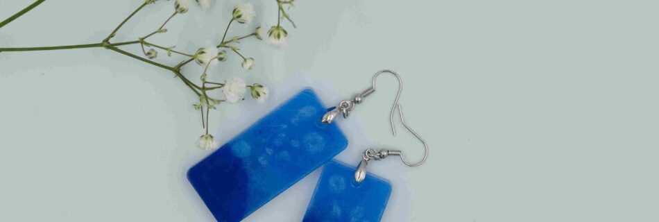 Cena: 130 PLN Numer artykułu: O13 Wymiary elementu: 2 x 3 cm Prostokątne kolczyki z transparentnej żywicy z kruszonym szkłem w odcieniach srebra i niebieskiego.Kolor dzieli prostokąt na trójkąty — eleganckie i nowoczesne. Podobne