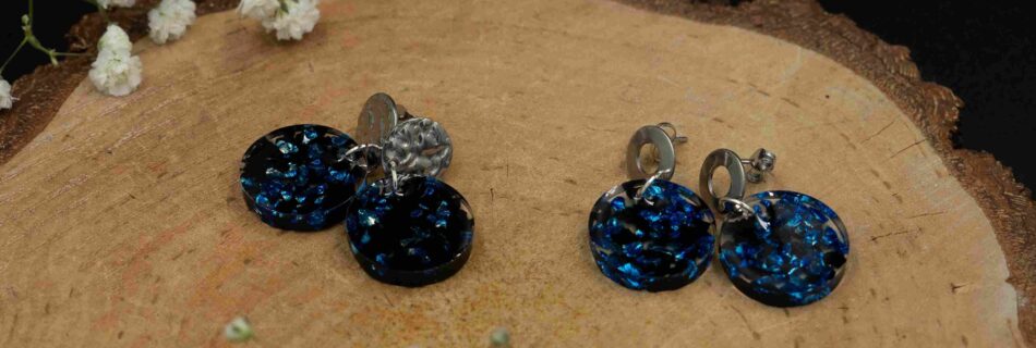 Cena: 115 PLN Numer artykułu: O15 Wymiary elementu: 2 x 2 cm Kolekcja:Imagination Niepozorne a zjawiskowe, okrągłe kolczyki z żywicy z zatopionym kruszonym szkłem w odcieniach granatu i czerni.Stonowane i uniwersalne — drobny akcent z charakterem. Podobne