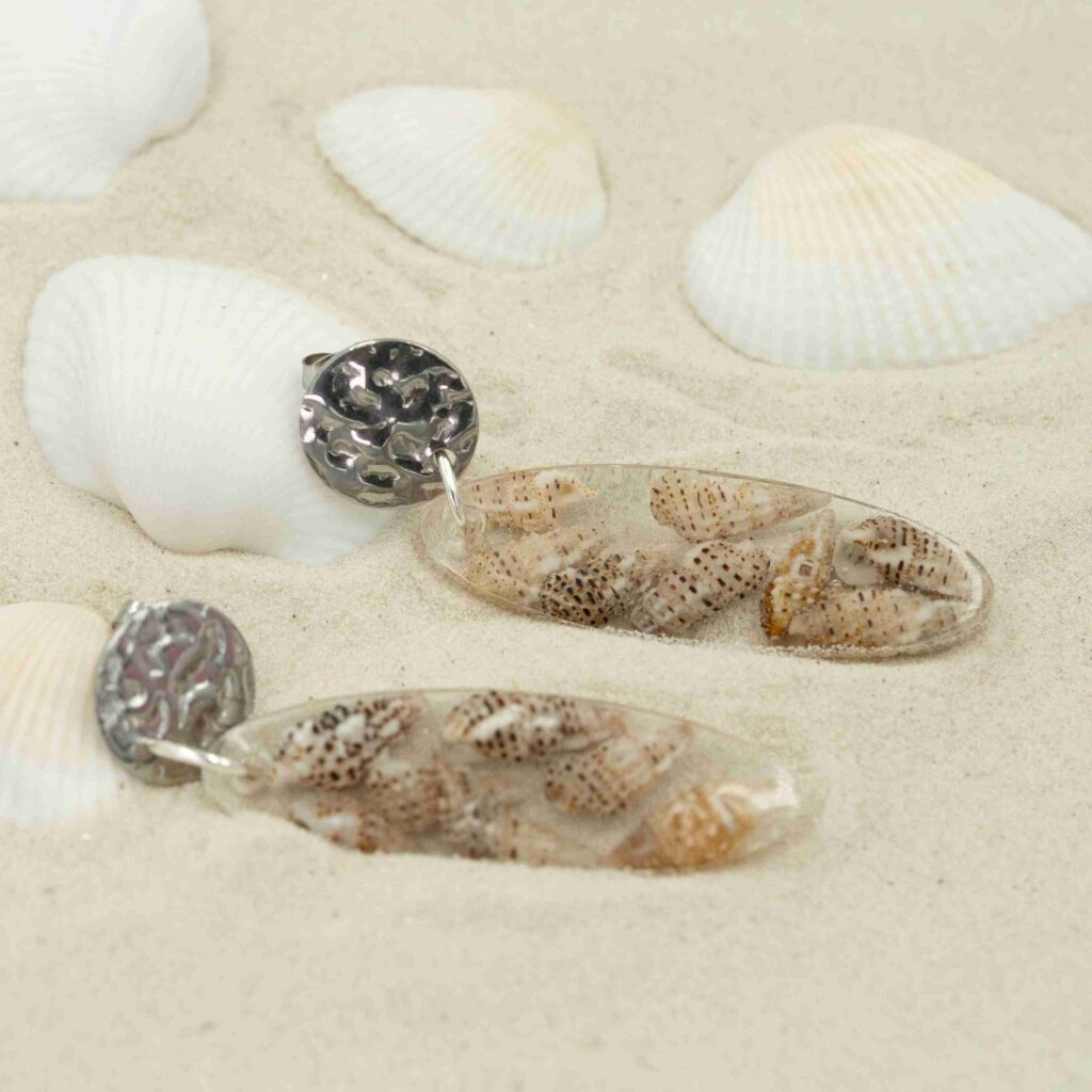 Długie kolczyki z transparentnej żywicy z drobnymi, naturalnymi muszelkami.