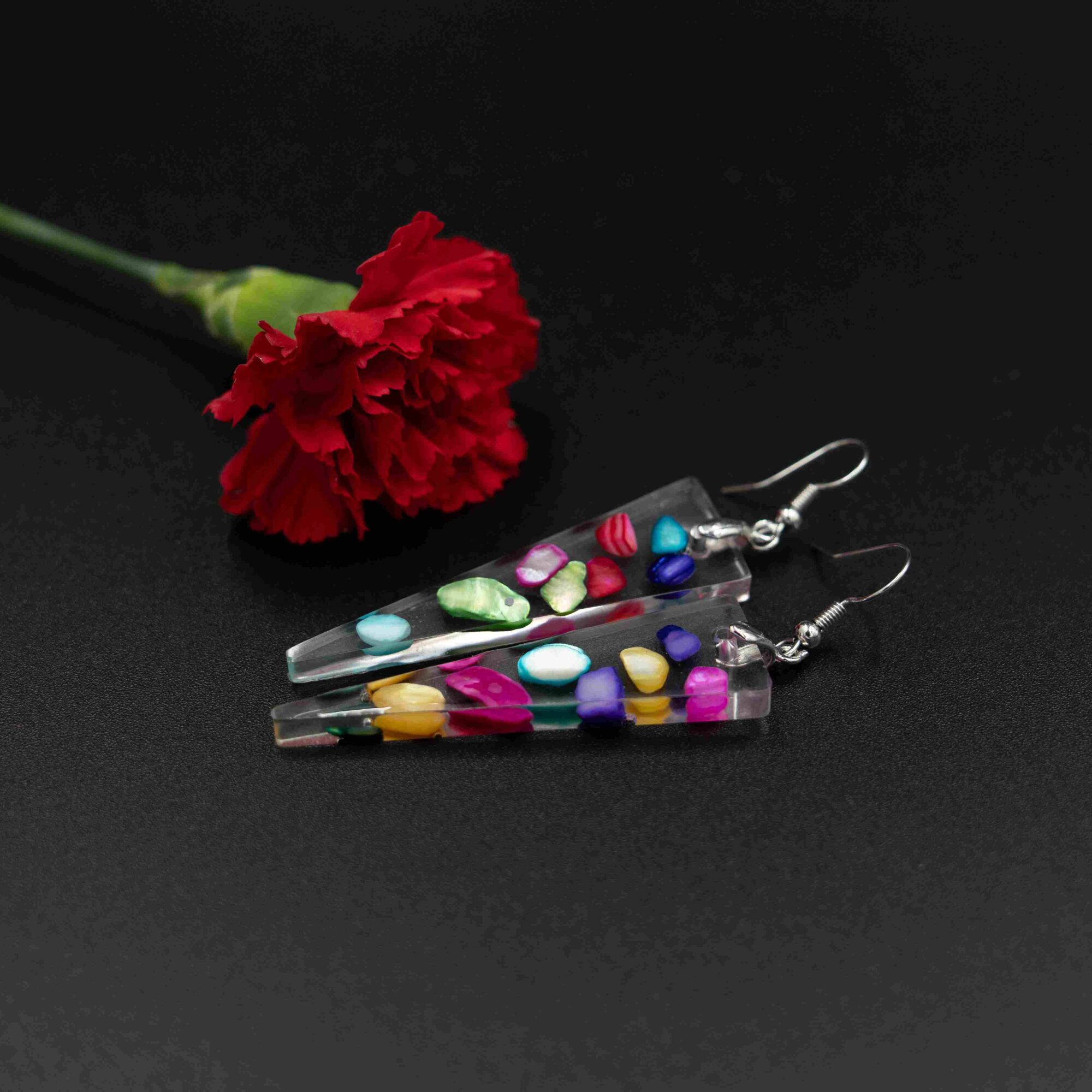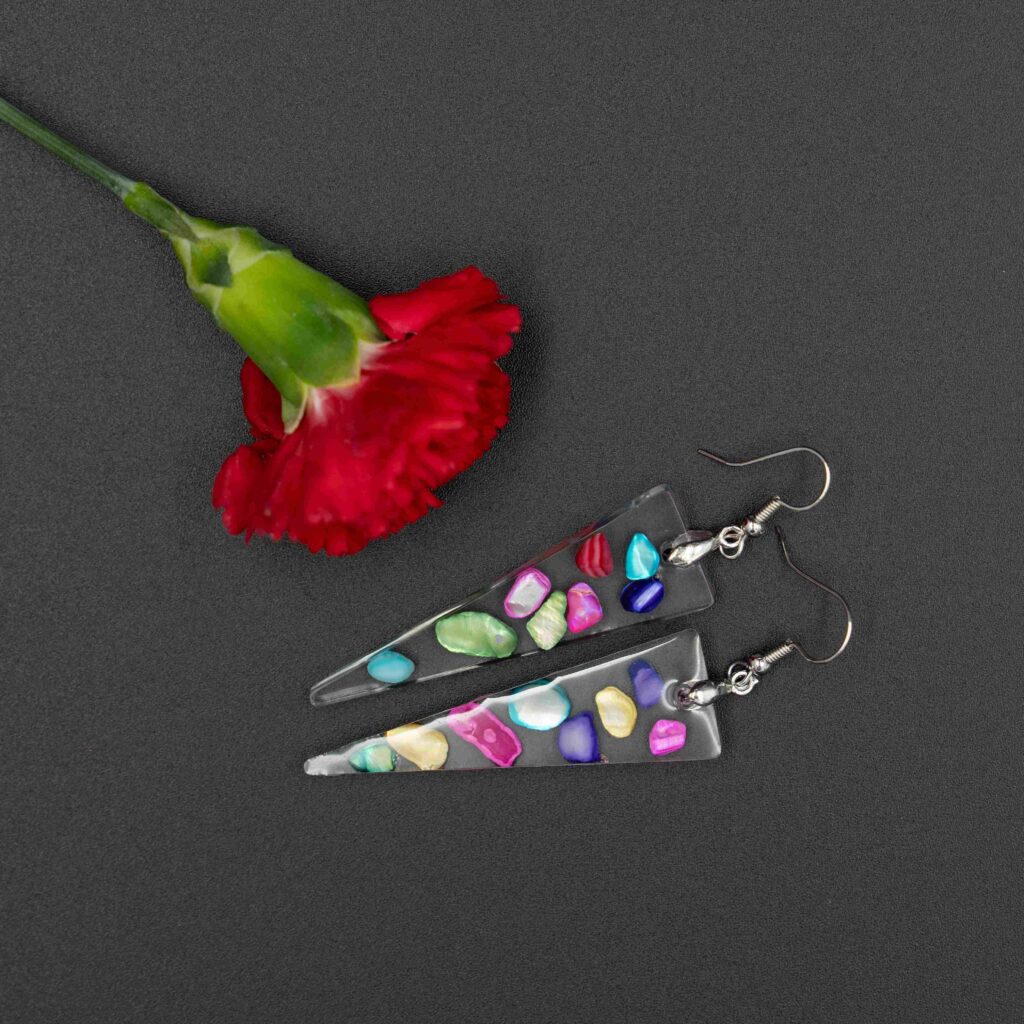 Długie kolczyki w kształcie trójkątów z transparentnej żywicy z kolorowymi odłamkami muszli.