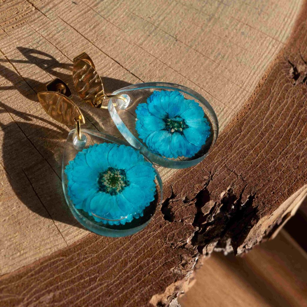 Spokojne, wiszące kolczyki z zatopionym niebieskim kwiatem w przepięknym żywym kolorze.