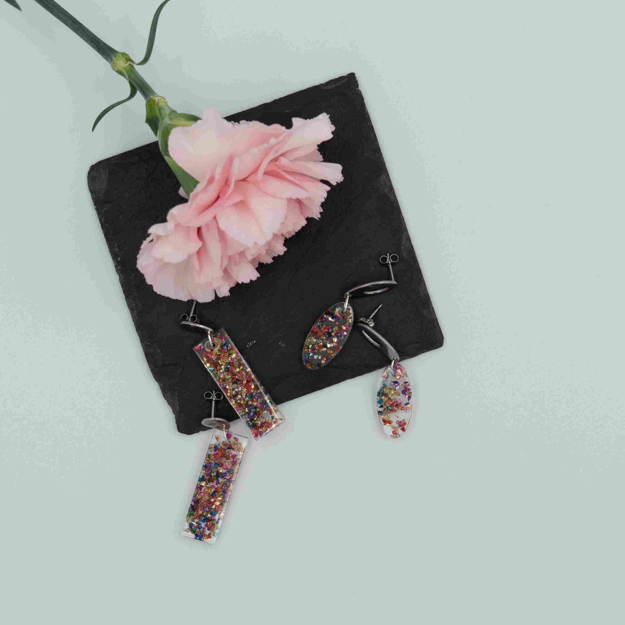 Prostokątne kolczyki z transparentnej żywicy z kolorowym kruszonym szkłem.