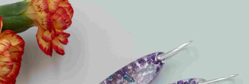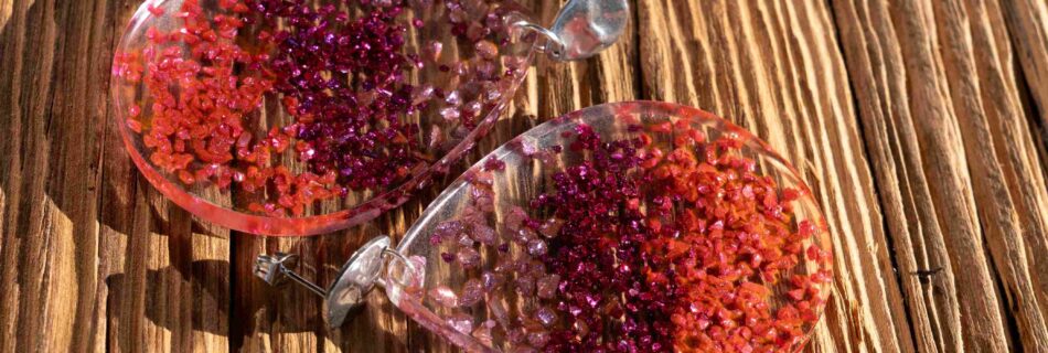 Cena: 140 PLN Numer artykułu: O14 Wymiary elementu: 4 x 5 cm Kolekcja: Imagination Duże kolczyki w kształcie kropli, z transparentnej żywicy wypełnione kruszonym szkłem w odcieniach różu i fioletu.Wyraziste i pełne koloru — lekkość formy z artystycznym charakterem. Podobne