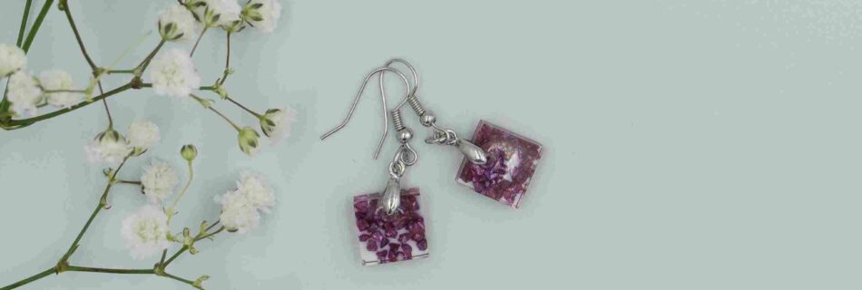 Cena: 105 PLN Numer artykułu: O16 Wymiary elementu: 5 x 25 cm Kolekcja: Imagination Kwadratowe kolczyki z żywicy z kruszonym szkłem w odcieniu między różem a fioletem.Zwyczajne–niezwyczajne — proste, a jednak przyciągające wzrok. Podobne