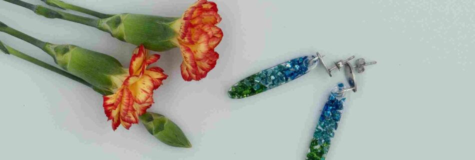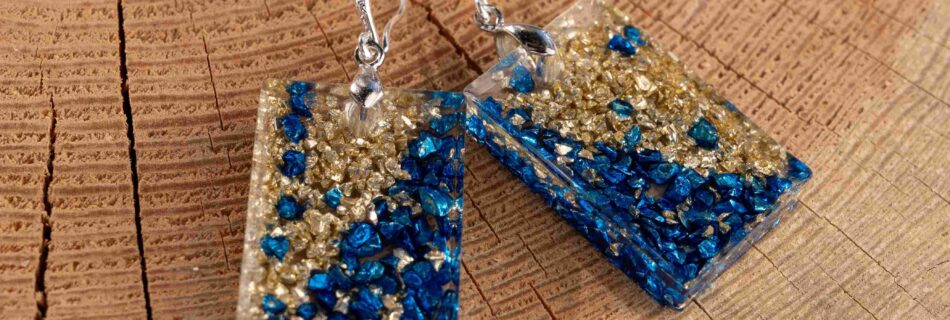 Cena: 130 PLN Numer artykułu: O13 Wymiary elementu: 2 x 3 cm Prostokątne kolczyki z transparentnej żywicy z kruszonym szkłem w odcieniach srebra i niebieskiego.Kolor dzieli prostokąt na trójkąty — eleganckie i nowoczesne. Podobne