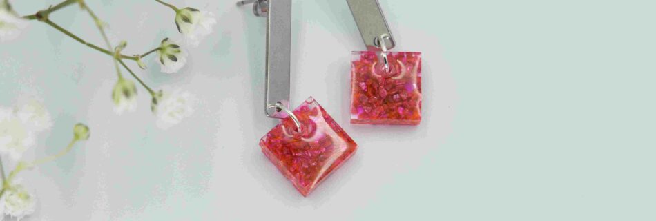 Cena: 105 PLN Numer artykułu: O21 Wymiary elementu: 1,2 x 1,2 cm Kolekcja: Imagination Kwadraty z transparentnej żywicy z zatopionym różowym szkłem, zawieszone na prostokątnym elemencie.Geometryczne, lekkie i z nowoczesnym akcentem. Podobne