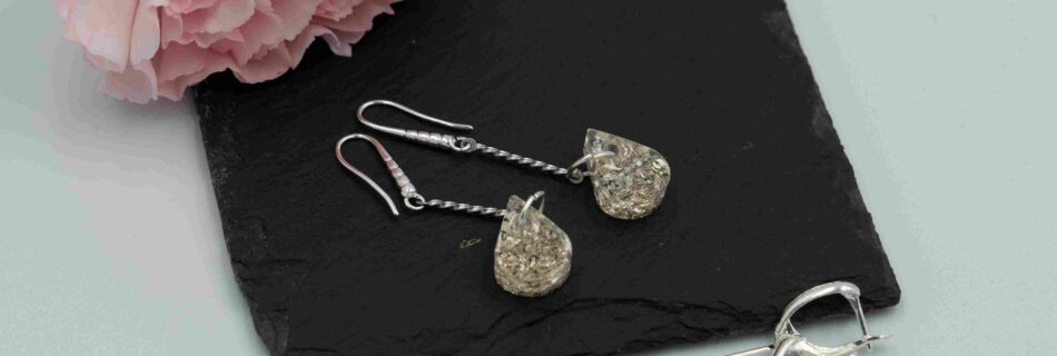 Cena: 105 PLN Numer artykułu: I21 Wymiary elementu: 1 x 1,3 cm Kolekcja: Małe łezki z transparentnej żywicy z zatopionym srebrnym kruszonym szkłem, zawieszone na dekoracyjnych srebrnych elementach.Delikatne i błyszczące — subtelny akcent o eleganckim wykończeniu. Podobne