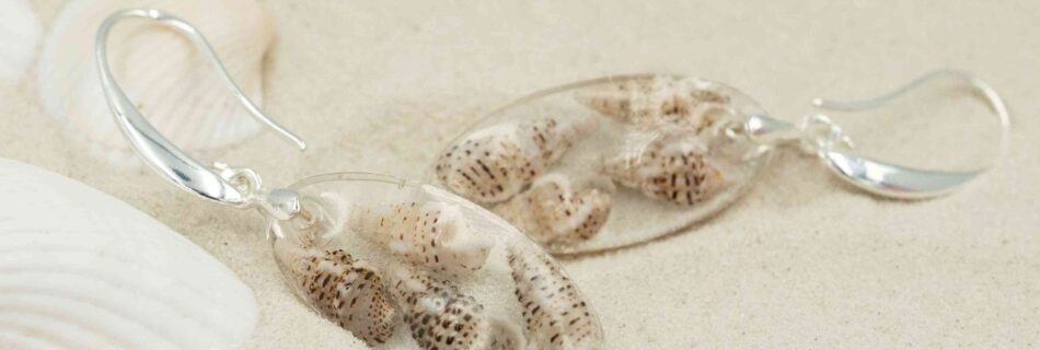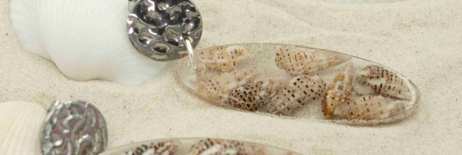 Cena 115 PLN Numer artykułu: O4 Wymiary: 1 x 2,5 cm Kolczyki z transparentnej żywicy wypełnione drobnymi, naturalnymi muszelkami.Lekkie i pełne detali — morski akcent w nowoczesnej formie. Podobne