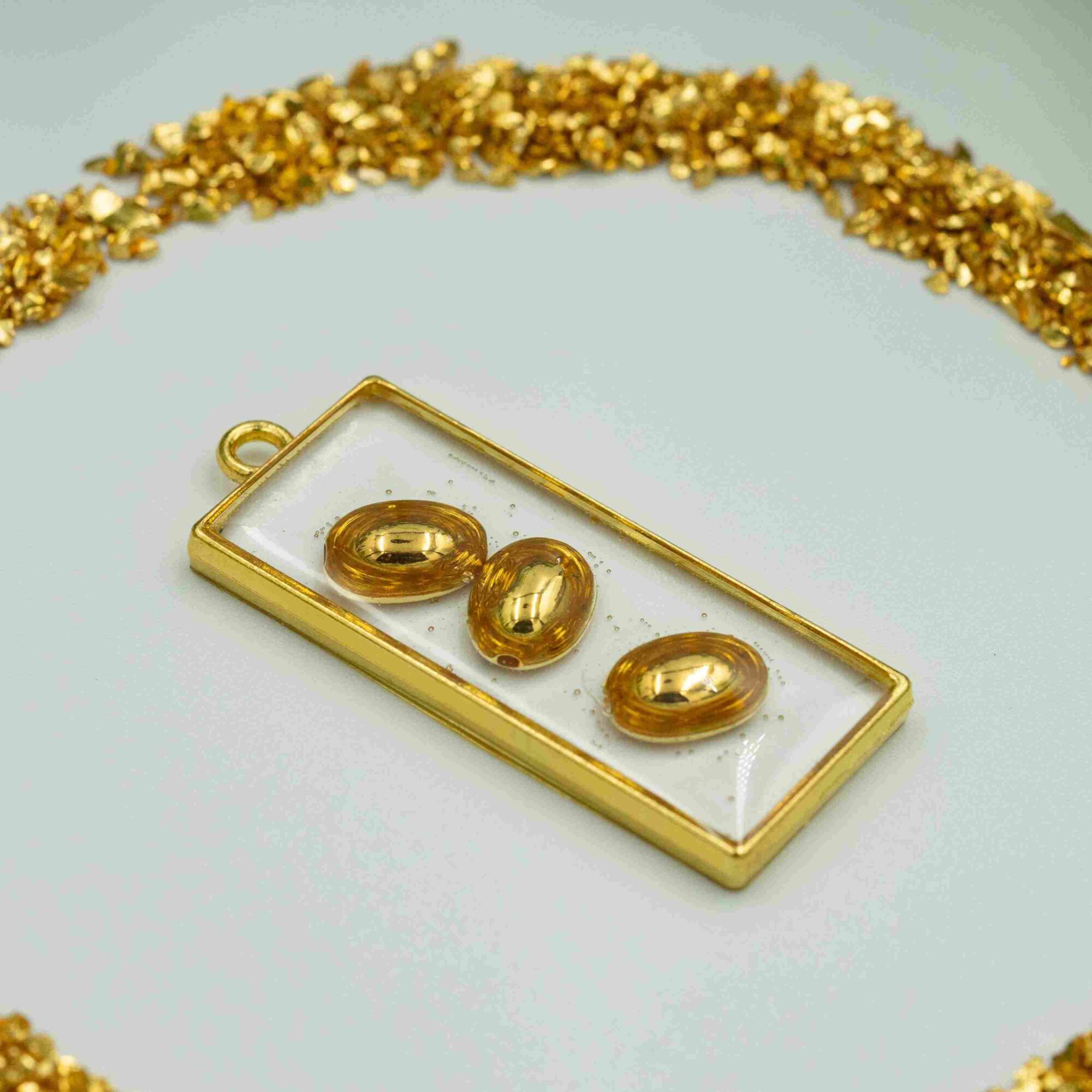 Złota zawieszka z zatopionymi „tył na przód” złotymi ziarnami kawy – dla osoby postronnej faktura ziarenka nie jest widoczna. Gratka dla fanek tego gorącego napoju:)